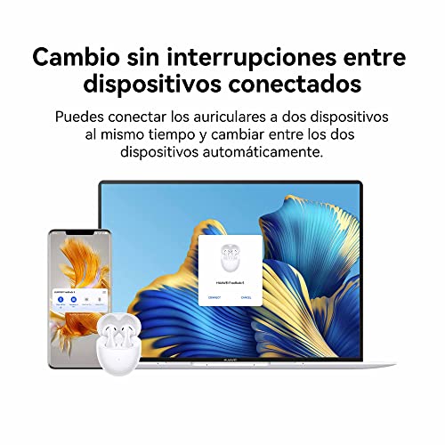 - Reproducción inteligente Conexiones perfectas entre dos dispositivos Abre el estuche de carga y tu teléfono, tableta o PC mostrará automáticamente una ventana emergente para emparejarlos o volver a conectarlos. Puedes conectar los auriculares a dos dispositivos al mismo tiempo y alternar entre ellos automáticamente. Audio que te acompaña Sincroniza el video y el audio, con el modo de baja latencia, para sumergirte en tus juegos favoritos. Más funciones en AI Life Descarga la aplicación HUAWEI AI Life para disfrutar de más funciones divertidas y fascinantes.