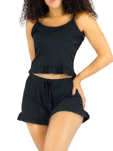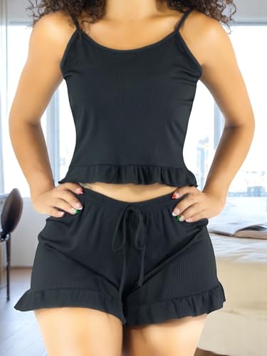 - Ambos extremos, tanto del top como del short, están decorados con un volante fruncido, que añade un toque femenino, coqueto y juvenil