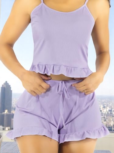 - Ambos extremos, tanto del top como del short, están decorados con un volante fruncido, que añade un toque femenino, coqueto y juvenil