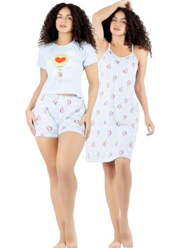 - Diseño versátil en 3 piezas, Incluye un conjunto de camiseta con short y una bata tipo camisón, ideal para adaptarse a diferentes climas y preferencias de uso