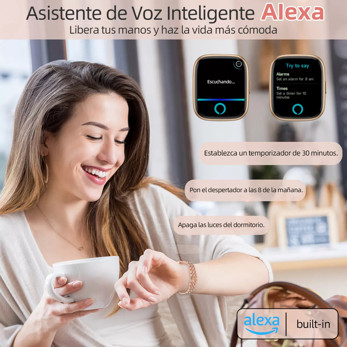 - Asistente Alexa Integrado: Controla dispositivos conectados a Amazon mediante comandos de voz, directamente desde tu muñeca.