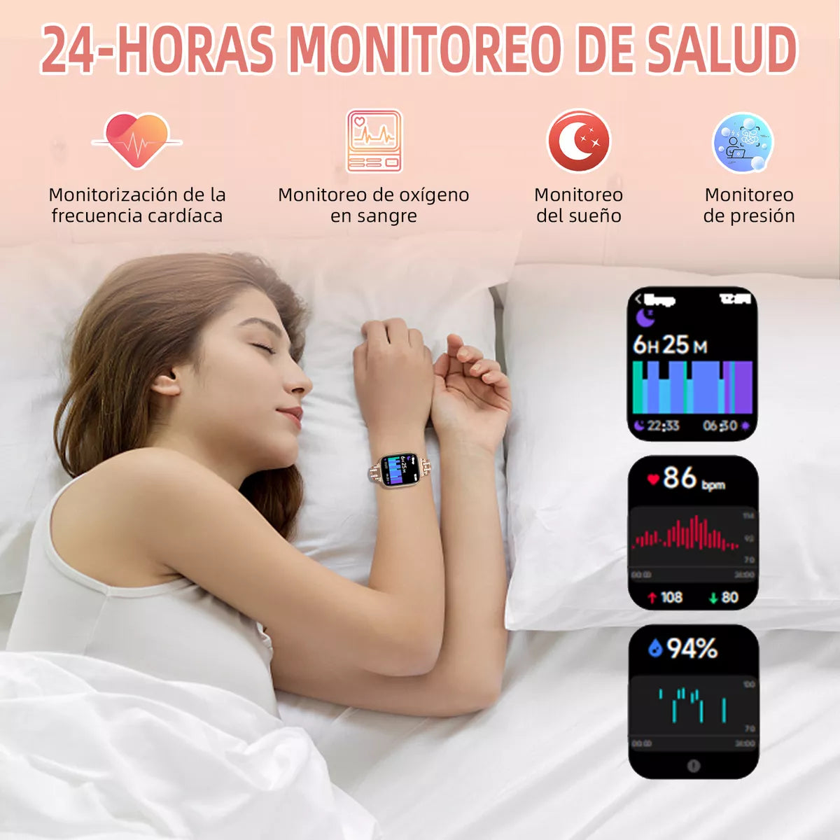 - Monitorización de Salud: Realiza un seguimiento continuo de tu frecuencia cardíaca, oxígeno en sangre (SpO2) y análisis de sueño para mantener tu salud bajo control.