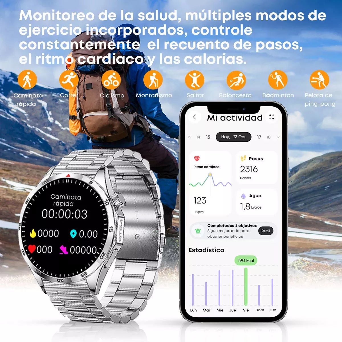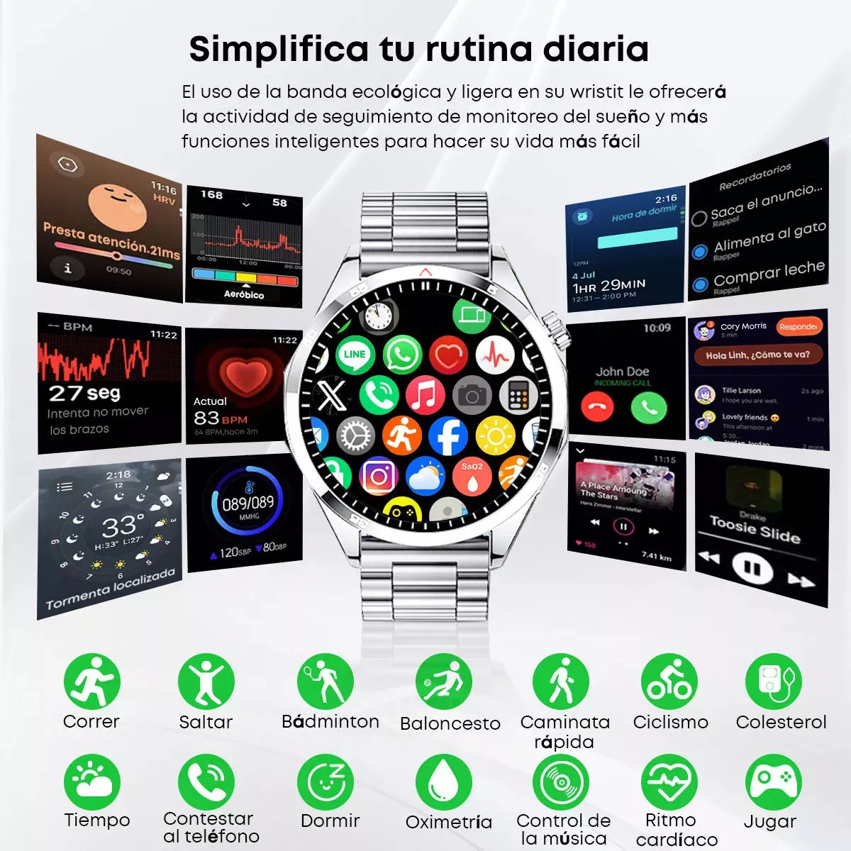 - Monitoreo de Salud: Seguimiento continuo de ritmo cardíaco, oxígeno en sangre, estrés, calidad del sueño, y más.