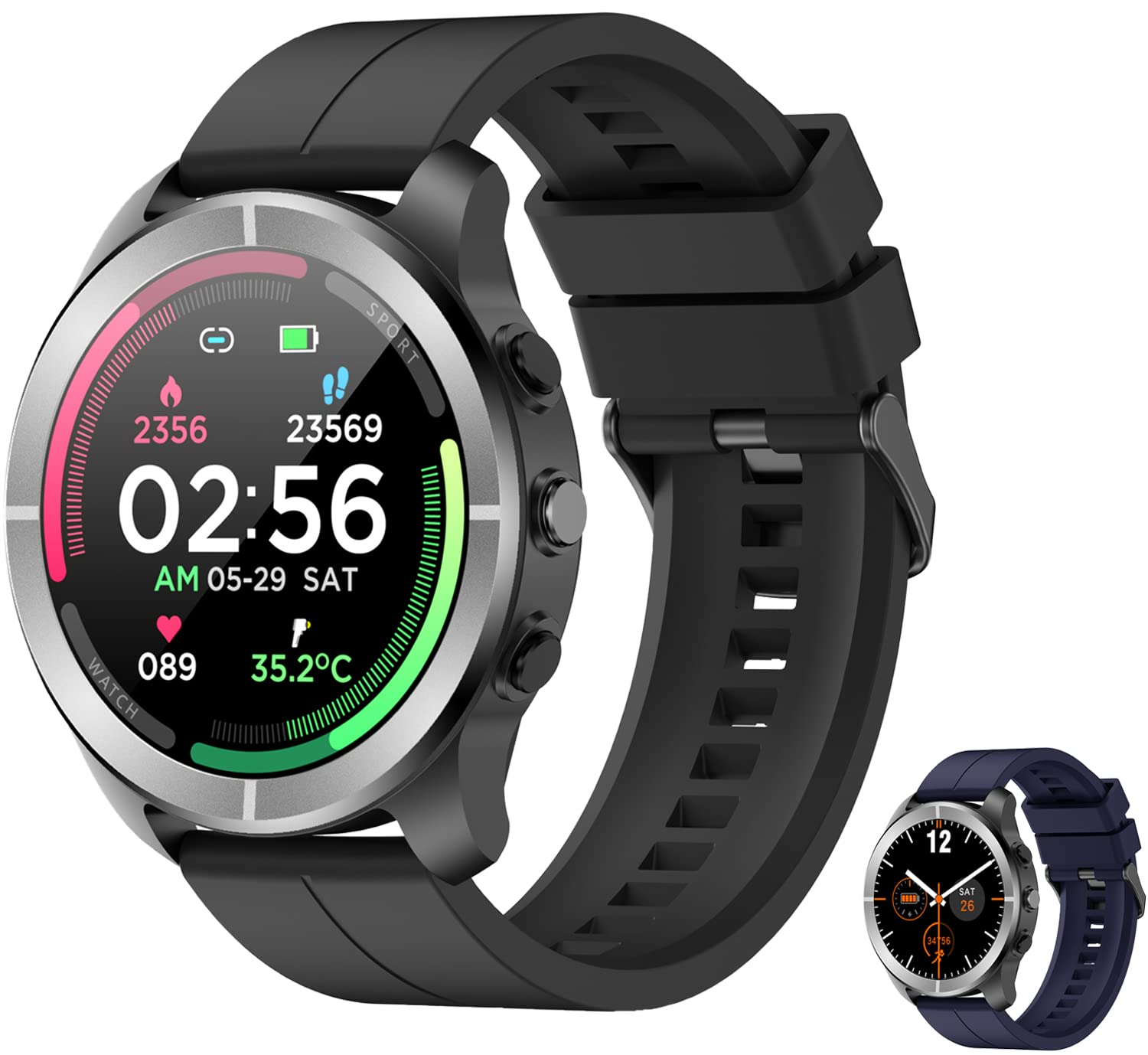 Reloj Inteligente Deportivo con Monitor de Frecuencia Cardíaca, Notificaciones, Música, Sueño y 24 Modos de Entrenamiento para Hombre y Mujer (Correa Negra y Azul)